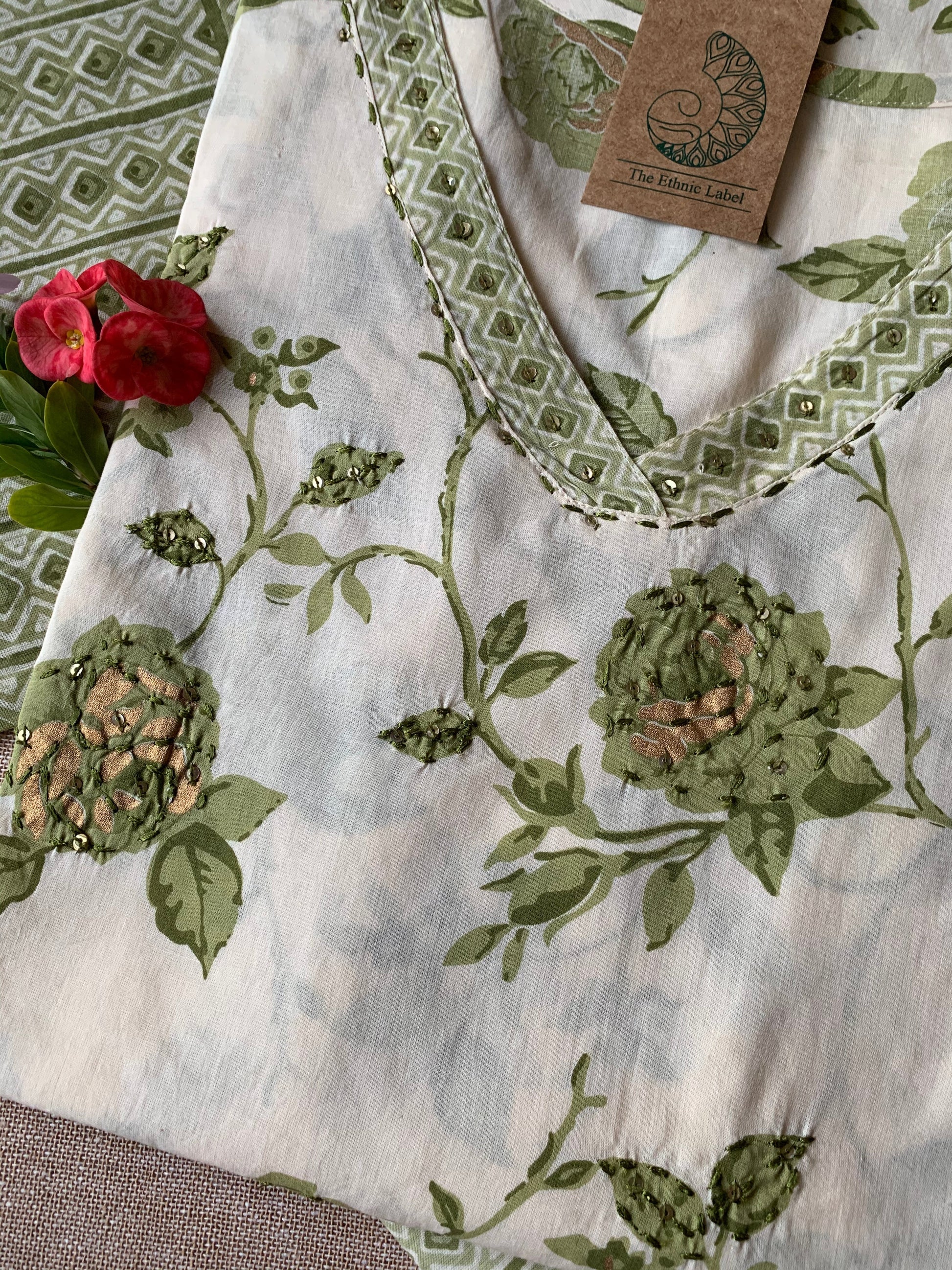 Cream Mehendi "Gold" Cotton Kurta Set with Dupatta - 3 pc