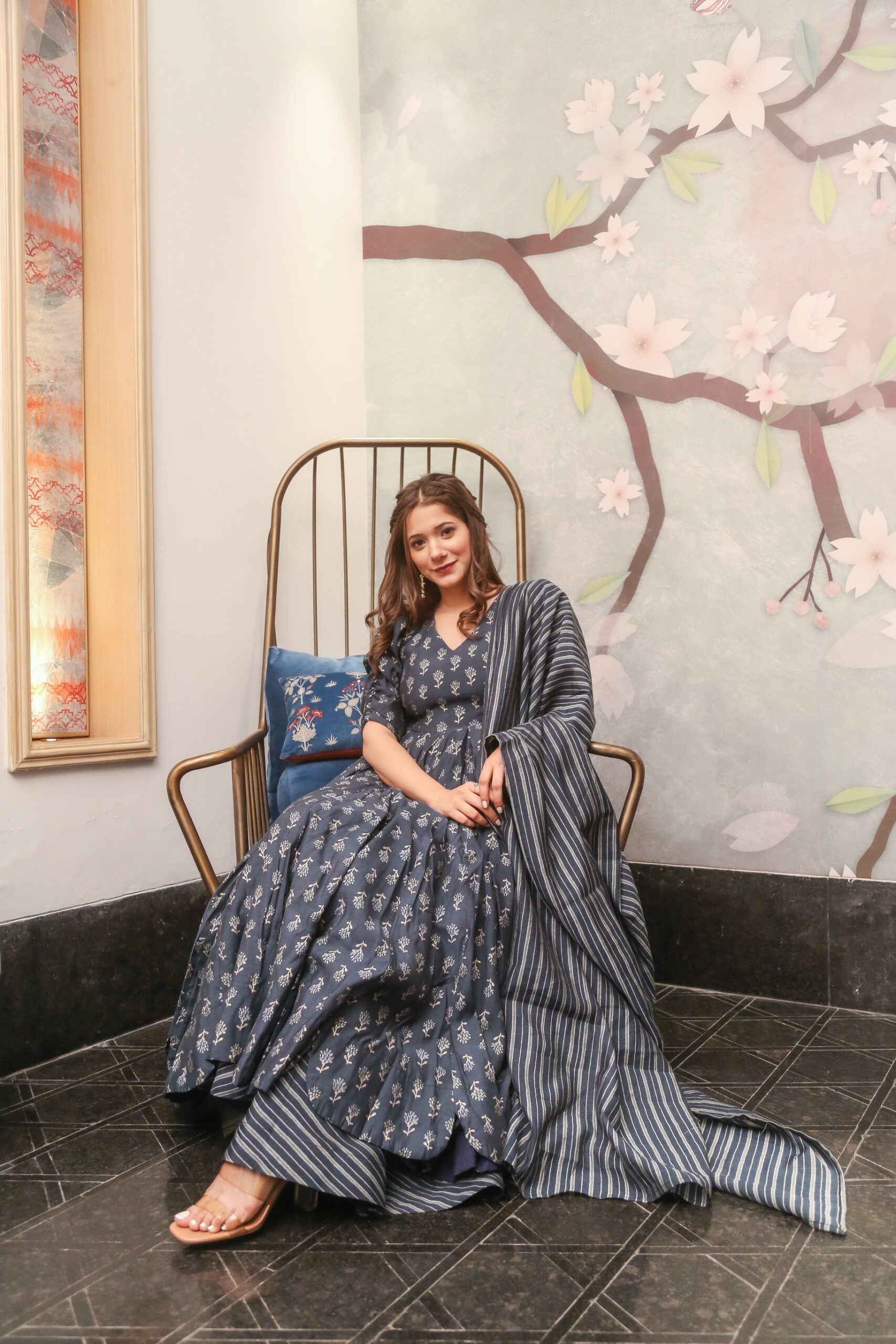 Decorated with ornate block prints on sumptuous muslin fabric, out rich suit set paired with a linear patterned dupatta and bottoms is a flawless blend of elegance and contemporary fashion.!
