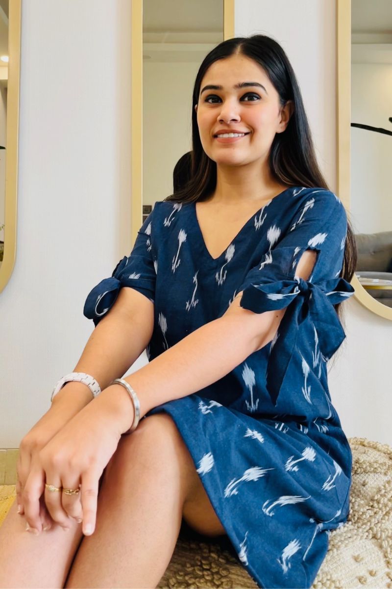 - The dress comes with a V-neck and half sleeves with a bow tie.