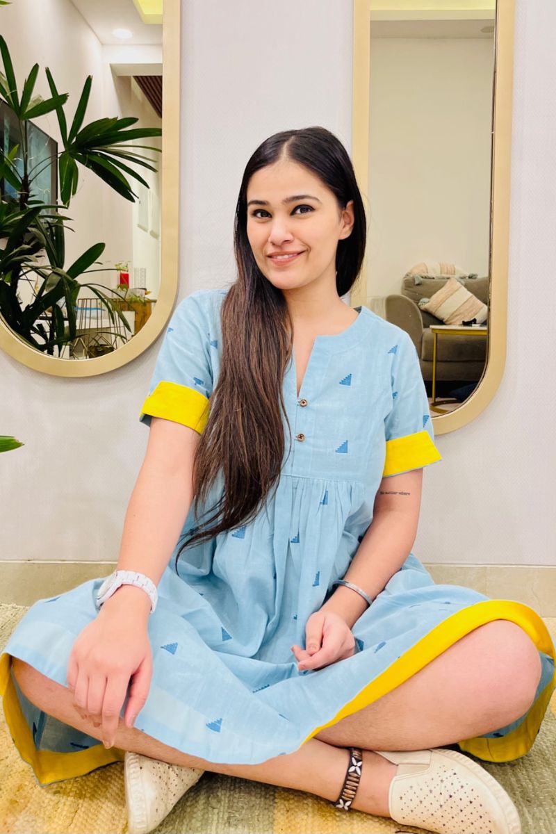 - The dress has a round neck with a V cut and contrast detailing on inner side of hem and sleeves