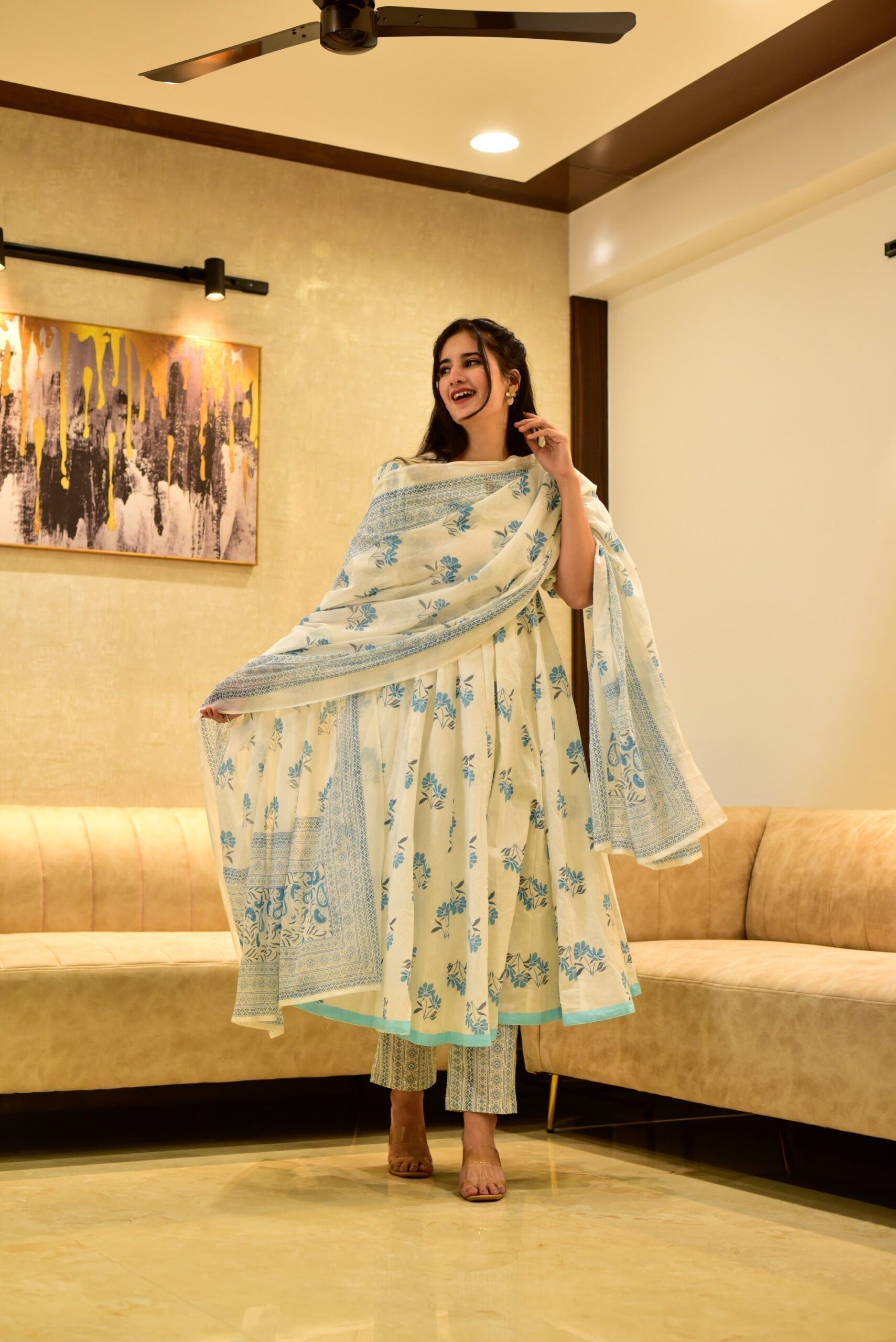 white & blue flora cotton suit set